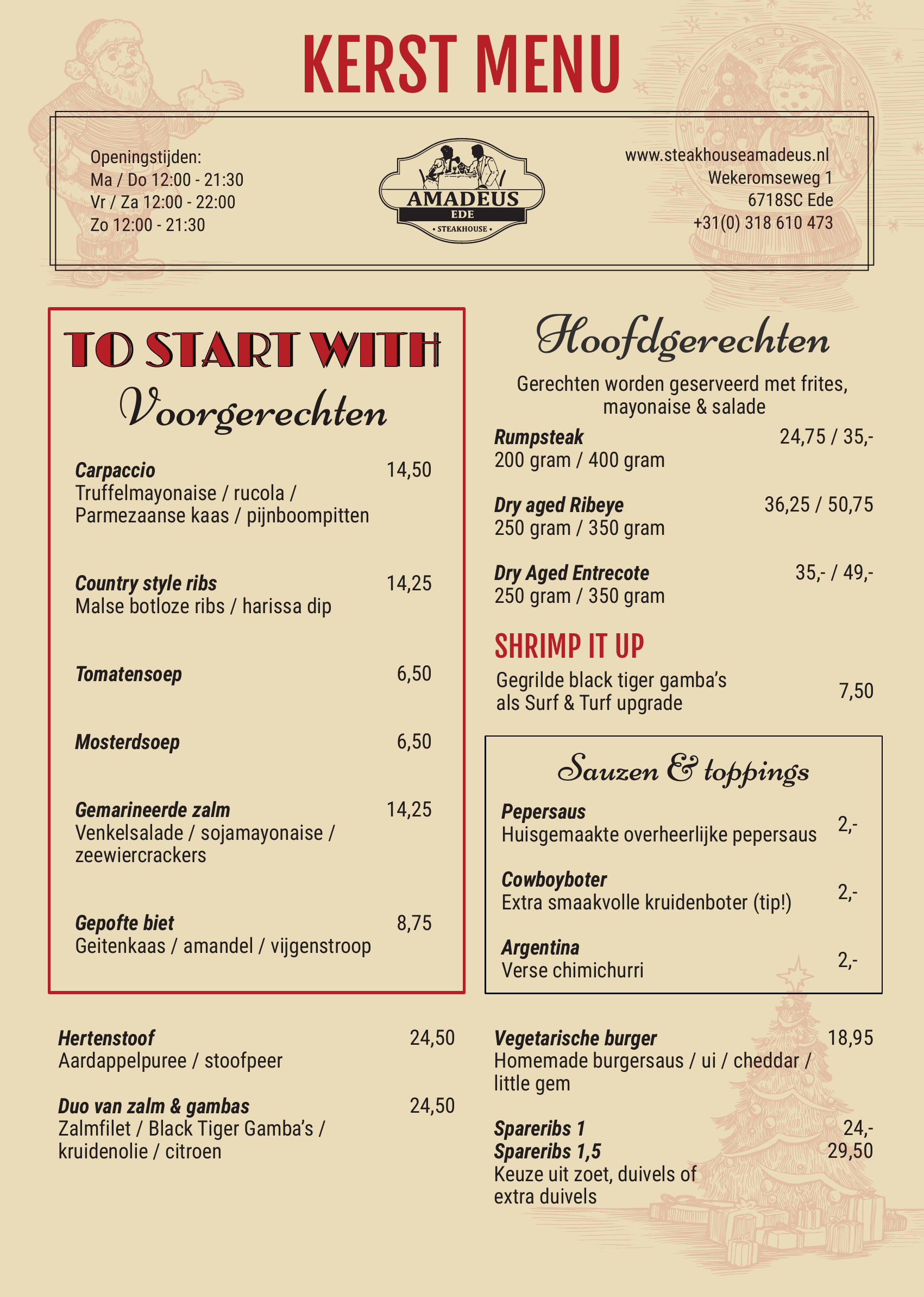 Vier kerst 2025 bij Steakhouse Amadeus Ede. Van 25 t/m 29 december serveren wij een speciaal kerstmenu — met de vertrouwde kwaliteit, gastvrijheid en snelheid die je van ons gewend bent.